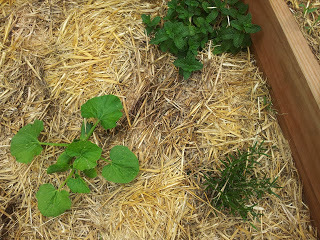 Also, a hay bale. I'm so glad we got all that hay for mulch. While it did have some seeds in it, we've found that a nice thick layer of hay keeps them from growing. It's nice to not really have to weed. Don't really have time for much of that this summer. There is also a little rhubarb plant in the other corner of the yard, and some asparagus (though those haven't come up at all - perhaps they are dead?). We had a couple leaves of lettuce on our hamburgers last week and they were oh, so good. Tender young ones.. Mmmm... Can't wait for more to come in!