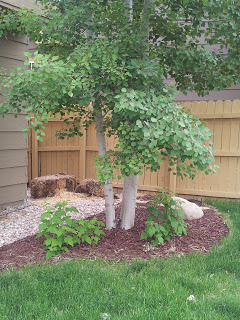 Mint (top), rosemary (right) and either a cucumber or zucchini plant (left) - maybe should have marked those :)These are the raspberries we planted under our aspens last year. They've gone gangbusters! My goal is for them to take over that bed. Well on our way!