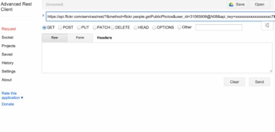 The Advanced REST Client��offers a generic web form that you can use to��craft an HTTP request, submit the request, and see the response. The screenshot below shows the Advanced REST Client in a Chrome tab. The top text box contains a request for the Flickr REST API. You can see the URL path and the URL parameters specifying the options needed for this particular request: the method (get public photos), the user ID of the person whose photos you want, and an API key.