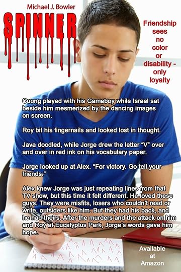 SPINNER is a teen horror thriller that some reviewers have compared to Stephen King’s “It,” which I find very flattering. This book features teen protagonists who have disabilities and modeled on kids I taught for many years in my career as a high school teacher. I went overboard on the memes for this one. LOL Here are some that I used to promote this 2015 release. Enjoy!