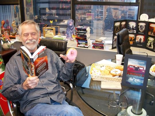 One of my heroes, Chris Crutcher, reading the paperback of Black Hole Sun in the office of our editor. Note Crutcher's prowess at reading upside down while spearing a donut that I'm sure someone tossed him.