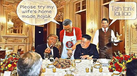The cartoon drawing (I don’t own it and may be subject to copyright] shows local sentiments. “Rojak” is a delicacy of deep-fried dough with chili while “Tek Tarik” is tea with milk made by pouring and pulling between two mugs. You can see how the tea is done here on YouTube. The servers in the cartoon are the PM of Singapore and the Minister of Foreign Affairs.