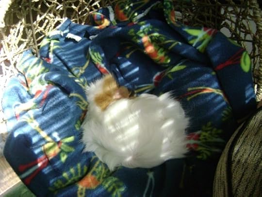 Some guinea pigs are neither joiners, nor outdoors pigs; like Snuffy, seen here napping in the hanging wicker bed instead of lost.