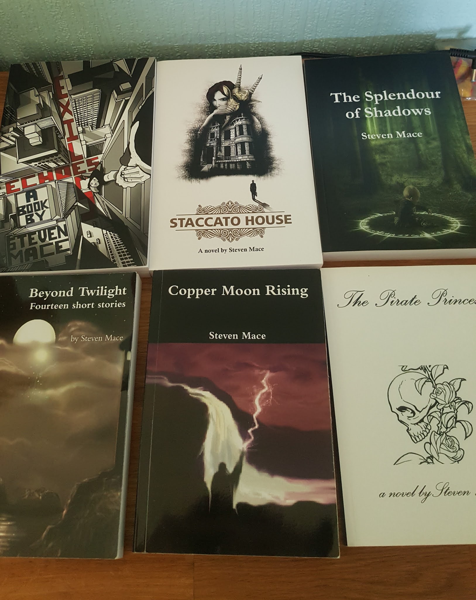 I have written and published six books. There are two full length novels: Copper Moon Rising and Staccato House; three collections of short stories: Beyond Twilight, The Splendour of Shadows and Echoes and Exiles; and a YA novella, The Pirate Princess.