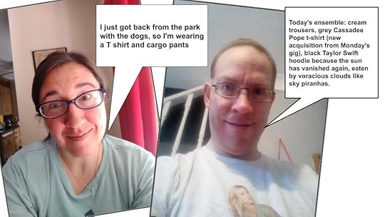 Today’s ensemble: cream trousers, grey Cassadee Pope t-shirt (new acquisition from Monday’s gig), black Taylor Swift hoodie because the sun has vanished again, eaten by voracious clouds like sky piranhas.