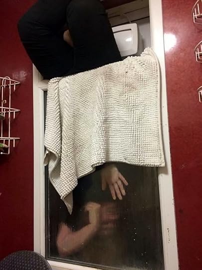 Under any other circumstances, the egg she laid would have impressive. We are clearly talking Guinness World Record sized turd, because try as she might, it would not flush away. Rather than getting a bucket of water, or covering the offending article with tissue, poo panic set in, and poo panic logic dictated that the best course of action would be too fish said faeces out of the bowl, and fling it out of the window… one can only presume with the hope of blaming a passing horse… Unfortunately, the plan went awry went the sash window turned out to have a second pane of glass behind the first, trapping the offending turd in the gap. Not to be defeated by mere glass, our intrepid hero then climbs up and reaches in to retrieve the offending specimen, only to get stuck, see picture below…