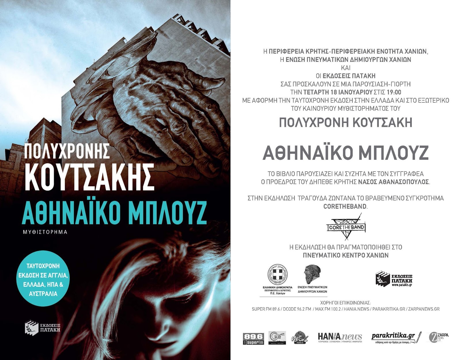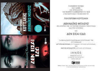 Για όσους φίλους μπορούν να έρθουν σε κάποια από τις παρουσιάσεις των καινούργιων βιβλίων μου που θα γίνουν στα Χανιά και στην Αθήνα:Στις 23 Δεκεμβρίου, δηλαδή την ερχόμενη Παρασκευή, μαζί με το αγαπημένο μου θεωρητικό φροντιστήριο Πρωτοπορία για μια ακόμα φορά, θα παρουσιάσουμε θεατρικά, επί σκηνής του Πνευματικού Κέντρου, το «Δεν είσαι εδώ», που κλείνει την αστυνομική «Τριλογία της Κρήτης».Στις 12 Ιανουαρίου, στον ΙΑΝΟ της Αθήνας, παρέα με δύο σπουδαίες κυρίες, συγγραφείς και κριτικούς λογοτεχνίας, την Μαρίζα Ντεκάστρο και την Αργυρώ Μουντάκη, θα παρουσιάσουμε το «Αθηναϊκό Μπλουζ» που εκδίδεται ταυτόχρονα εκείνη την ημέρα στην Ελλάδα και στην Αγγλία, και το «Δεν είσαι εδώ».Και στις 18 Ιανουαρίου, στο Πνευματικό Κέντρο Χανίων, γιορτάζουμε την έκδοση του «Αθηναϊκού Μπλουζ» παρέα με τον φίλο, πρόεδρο του ΔΗΠΕΘΕ Κρήτης Νάσο Αθανασόπουλο που θα παρουσιάσει το βιβλίο και θα συζητήσουμε γι’ αυτό. Ο Νάσος μου κάνει την διπλή τιμή να περάσει την ημέρα της γιορτής του παρουσιάζοντας το βιβλίο. Για να είναι μεγαλύτερη η γιορτή, θα έχουμε και μουσική, και μάλιστα μουσική που θα ενώσει τους μεγαλύτερους και τους μικρότερους σε ηλικία αναγνώστες. Το χανιώτικο ροκ συγκρότημα Coretheband που ήδη έχει κάνει αίσθηση στην Ελλάδα και όπως μαθαίνω ετοιμάζει τα πανιά του για το εξωτερικό, θα παίξει liveστην σκηνή του Πνευματικού Κέντρου. Θα ξεκινήσουν με μπλουζ κομμάτια που ακούγονται τακτικά από το τζούκμποξ στο Papi’s, το μπαρ που πρωταγωνιστεί στο «Αθηναϊκό Μπλουζ», όπως το “Everytimewesaygoodbye” της Έλλα Φιτζέραλντ, το “I’m a fool to want you”, της Μπίλι Χόλιντεϊ, το “Cry me a river” της Ντάινα Ουάσινγκτον, δίνοντας την δική τους ερμηνεία στα κομμάτια που αγαπούν πολύ οι μεγαλύτεροι. Και θα συνεχίσουν με τραγούδια του συγκροτήματος, που ήδη αγαπούν πολύ οι νεότεροι.Ακολουθούν οι προσκλήσεις.