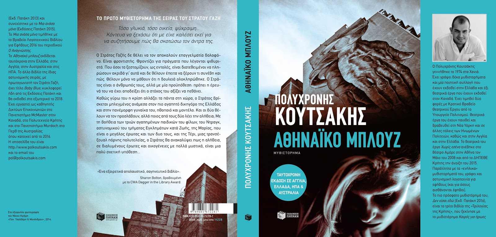 Το εξώφυλλο του Αθηναϊκού Μπλουζ στα αγγλικά (κυκλοφορεί από τον Bitter Lemon Press στις 12 Ιανουαρίου στην Αγγλία, τον Φλεβάρη στην Αυστραλία και τον Απρίλη στις ΗΠΑ) το είχα ποστάρει σε παλιότερο κείμενο, εδώ στο blog. Όμως μαζί με το οπισθόφυλλο, που πρόσφατα πήρα στα χέρια μου, ήρθε η πρώτη πολύ ευχάριστη έκπληξη.Η σπουδαία, βραβευμένη με το CWA Dagger in the Library συγγραφέας αστυνομικών μυθιστορημάτων και θρίλερ Sharon Bolton διάβασε το «Αθηναϊκό Μπλουζ» και έγραψε πως είναι «ένα εξαιρετικά απολαυστικό, σαγηνευτικό βιβλίο».Η δεύτερη πολύ ευχάριστη έκπληξη ήρθε όταν έλαβα, χθες από τον Πατάκη και το ελληνικό εξώφυλλο του βιβλίου – το βιβλίο κυκλοφορεί την ίδια μέρα, 12 Ιανουαρίου, και στην Ελλάδα. Ως συνήθως, ο Νίκος Κράψης, που σχεδιάζει όλα τα εξώφυλλα των βιβλίων μου, έκανε εξαιρετική δουλειά, κι έτσι τώρα δεν ξέρω ποιο εξώφυλλο μου αρέσει περισσότερο, το ελληνικό ή το αγγλικό.
