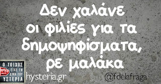 Επειδή μαθαίνω τις τελευταίες μέρες για αρκετές περιπτώσεις φίλων και γνωστών που τσακώθηκαν γερά για το δημοψήφισμα, ανακεφαλαιώνω:Αν η κυβέρνηση μας λέει την αλήθεια, σε αυτή την τόσο δύσκολη στιγμή για την χώρα (οπότε, η στοιχειώδης πατριωτική συνείδηση επιβάλλει να λέει τουλάχιστον τώρα, την ύστατη στιγμή, την αλήθεια), τότε θα έχουμε σύντομα συμφωνία, ΑΝΕΞΑΡΤΗΤΩΣ αποτελέσματος στο δημοψήφισμα. Αν έρθει «ναι» θα έχουμε (περίπου) την συμφωνία του δημοψηφίσματος. Αν έρθει «όχι», η κυβέρνηση ελπίζει (οι Ευρωπαίοι το διαψεύδουν) ότι θα έχει μια λίγο καλύτερη συμφωνία, όπως π.χ. την δική της, που περιλαμβάνει μέτρα 8 ΔΙΣ ΕΥΡΩ, επιπλέον των μέτρων των Σαμαρά-Βενιζέλου, τα οποία ΔΕΝ ΚΑΤΑΡΓΕΙ.Κι εσύ, ο τσατίλας, σκοτώνεσαι με τους φίλους και τους γνωστούς σου, είτε κατά πρόσωπο, είτε με ειρωνείες είτε με βρισιές στο Facebook. Για ένα κάλπικο δημοψήφισμα, επί μιας πρότασης που έχει ήδη αποσυρθεί από τους Ευρωπαίους! Ψηφίζεις 'ναι' ή 'όχι' πάνω σε κάτι που δεν υπάρχει, και λυσσάς γι' αυτό! Μπράβο.Γιατί τσακώνεσαι όμως στην πραγματικότητα; Επειδή, είτε ‘ναι’ ψηφίζεις είτε ‘όχι’ ελπίζεις ή φοβάσαι, αντίστοιχα, ότι η κυβέρνηση λέει ψέματα! Ελπίζεις ή φοβάσαι πως όλα αυτά τα κάνει με σχέδιο για να μας βγάλει από το Ευρώ και την Ευρωπαϊκή Ένωση. Αν έχεις άδικο, άξιζε να χάσεις ανθρώπους από κοντά σου και να γεμίζεις την καρδιά σου με μίσος; Αν έχεις δίκιο, άξιζε να χάσεις ανθρώπους από κοντά σου και να γεμίζεις την καρδιά σου με μίσος;(βρήκα την παρακάτω ατάκα στο Facebook, την προσφώνηση πάρτε την χαϊδευτικά)