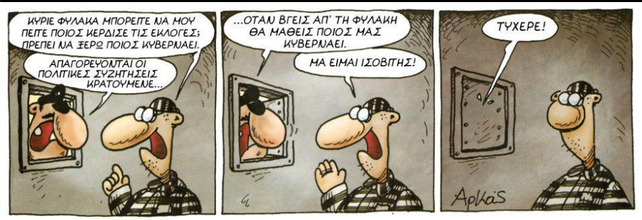 Το άρθρο της κυρίας Έλενας Ακρίτα στα Νέα εις βάρος του Αρκά (http://www.tanea.gr/opinions/all-opinions/article/5456575/h-periptwsh-arka/) πάσχει τόσο πολύ και από τόσες πλευρές ώστε αναρωτιέται κανείς πώς μια τόσο έμπειρη αρθρογράφος και συγγραφέας μπόρεσε να το υπογράψει. Από πού να το πιάσει κανείς; Από τον πληθυντικό της μεγαλοπρέπειας «Όλοι εμείς λοιπόν που σας θαυμάζουμε, απογοητευτήκαμε φίλτατε Αρκά»; Επειδή δεν αρέσει πια στην Ακρίτα ο Αρκάς, αυτό σημαίνει πως απογοητεύτηκαν ΟΛΟΙ από αυτόν; Δεν έχει μείνει ΕΝΑΣ άνθρωπος σε όλη την χώρα που να θαύμαζε τον Αρκά και να συνεχίζει να τον θαυμάζει; Η Έλενα Ακρίτα εκπροσωπεί, στο μυαλό της Έλενας Ακρίτα, όλη την χώρα;Μήπως να πιάσει κανείς το άρθρο από το ότι η κυρία Ακρίτα δηλώνει μεγάλη θαυμάστρια του «παλιού» Αρκά αλλά φαίνεται να αγνοεί σκίτσα του όπως το παρακάτω που έκραζαν τις παλιές κυβερνήσεις…