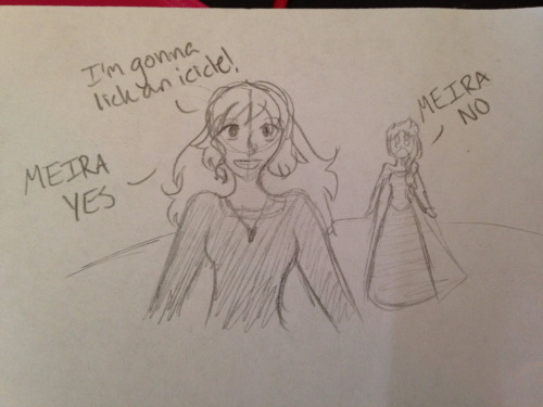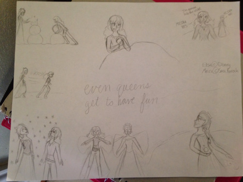 The top two drawings are of a sheet of doodles I did with the two. Even queens get to have fun! Then the close-up is of one of the doodles, showing how all the winter excitement can make Meira a little irrational.