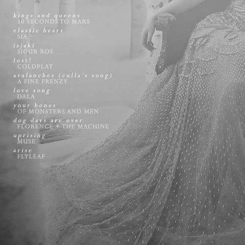 kings and queens, 30 seconds to mars // elastic heart, sia // isjaki, sigur ros // lost!, coldplay // avalanches (culla’s song), a fine frenzy // love song, dala // your bones, of monsters and men // dog days are over, florence + the machine // uprising, muse // arise, flyleaf