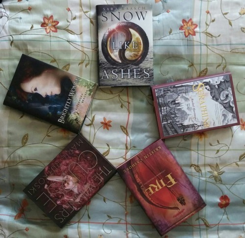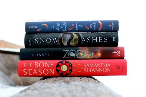 The Bone Season by Samantha ShannonI’ve only read 3 of these books (The Strange and Beautiful Sorrows of Ava Lavender, Snow Like Ashes, and The Bone Season) but all of them got 5 stars from me. I’ve heard amazing things about Zodiac and I plan on reading it soon, so I figured I would include it in this picture!