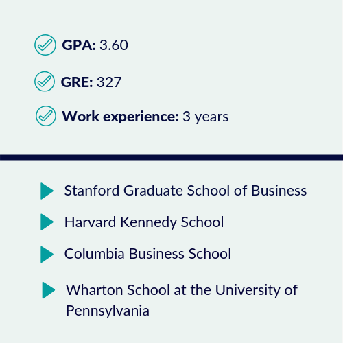 However, when it came to writing her personal essays, Nina felt stumped. She wanted someone to bounce her ideas off of and make her story come to life. Her ambition and resourcefulness led her to reach out to The Art of Applying®. After working with our team, she landed four acceptance letters from Stanford Graduate School of Business, Wharton, Columbia Business School, and Harvard Kennedy School!