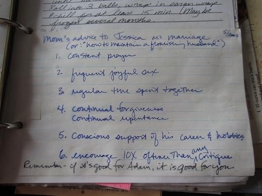 When I was about to be married, the women of my church threw me a shower, at which each of them gave me a favorite recipe to put in a cookbook for our new home. And though I still use Marion’s directions for teriyaki chicken, and though Sandy’s roasted veggies are still a favorite at our house, the real treasure in that cookbook isn’t the recipes. It’s the marriage advice each woman wrote down alongside her recipe.