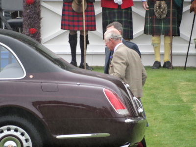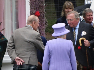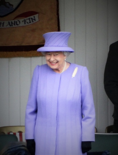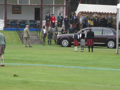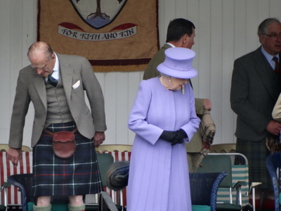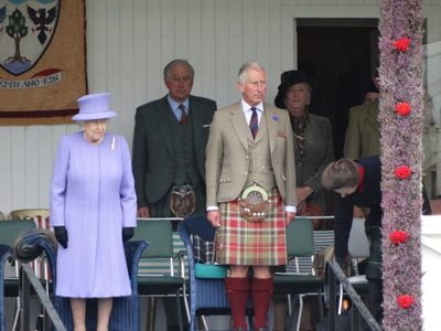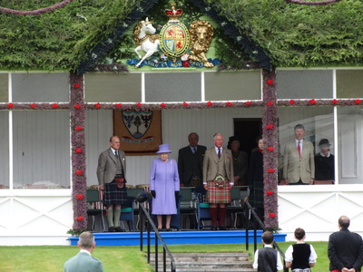At the games, we were treated to tug-o-wars, foot races, bagpipers by the dozens, men tossing the caber and the heavy hammer, spritely dancers, and great food. I met with a lovely couple at the MacRae booth. We chatted, I bought hubby a cap and myself a scarf, and we exchanged cards.But the excitement for the day was only beginning as Her Majesty, the Queen arrived with her party to the games. My photos are below, but here's a link to the Braemar Games fb page which has not only photos, but video clips! (Can ye hear the pipers?)