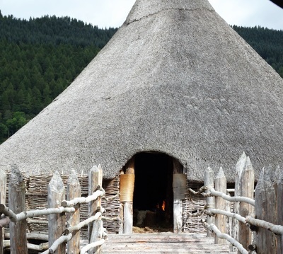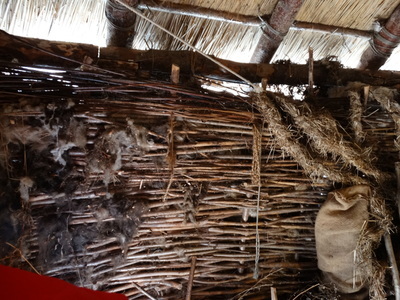 The floors were also covered with brackens to minimize the draft beneath your feet. The tall, conical roof shed rain and snow very well. Smoke would rise, escaping through cracks in the thatch. There was no hole in the center of the roof, but doors on either side could be opened to draw the smoke if necessary.