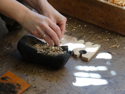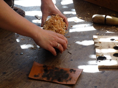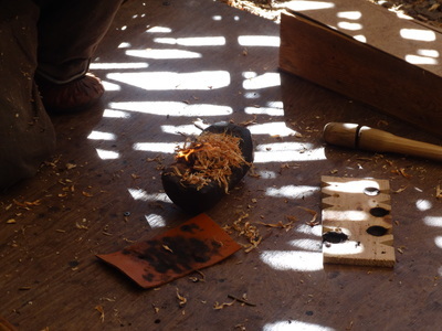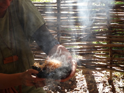 To create fire, she first filled a small 'boat' with bits of dry grass and tender. She then set a flat piece of wood with a circular divot that was the same size as the stick she would use onto a small piece of leather. (This one was meant to be used over and over, and with different size sticks)