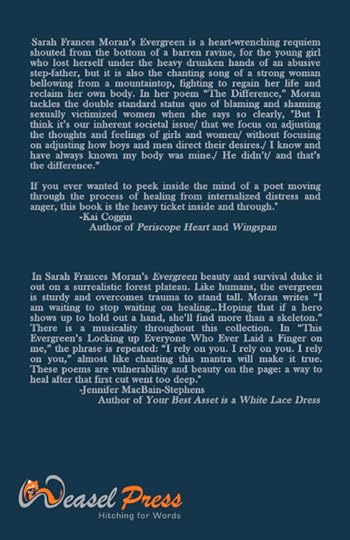 —Sarah Frances Moran’s Evergreen is a heart-wrenching requiem shouted from the bottom of a barren ravine, for the young girl who lost herself under the heavy drunken hands of an abusive step-father, but it is also the chanting song of a strong woman bellowing from a mountaintop, fighting to regain her life and reclaim her own body. In her poem “The Difference,” Moran tackles the double standard status quo of blaming and shaming sexually victimized women when she says so clearly, “But I think it’s our inherent societal issue / that we focus on adjusting the thoughts and feelings of girls and women / without focusing on adjusting how boys and men direct their desires. / He didn’t / and that’s the difference.”