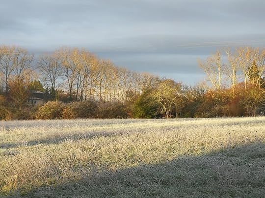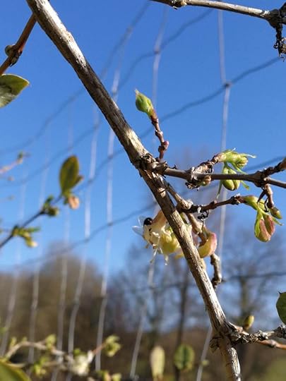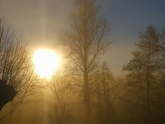 Sun spills across the frost warm as butter, and the day wakes. Birds sing tentative spring songs, and I can hear the water rushing in the stream, the rattle of the oaks’ dried leaves that will cling until the last breath of winter. I open a window and let in the keen new air. A cock crows, then another and another. Dogs bark. The air shivers, shrugging off the sounds, casting only cold stillness into the room. But the stillness is just a pause, a step poised to land on unknown territory. The foot completes its movement, the silence shivers again and fills with the humming of bees.