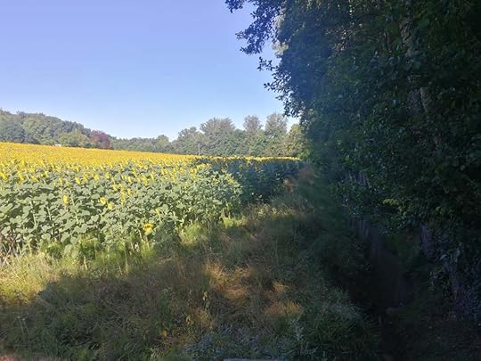 We walked around the place today across the stream. Sunflowers fill the small field behind the poplars and the alders.