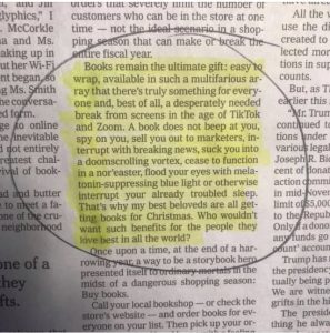 Books remain the ultimate gift: easy to wrap, available in such a multifarious array that there’s truly something for everyone and, best of all, a desperately needed break from screens in the age of TikTok and Zoom. A book does not beep at you, spy on you, sell you out to marketers, interrupt with breaking news, suck you into a doomscrolling vortex, cease to function in a nor’easter, flood your eyes with melatonin-suppressing blue light or otherwise interrupt your already troubled sleep. That’s why my best beloveds are all getting books for Christmas. Who wouldn’t want such benefits for the people they love best in all the world?