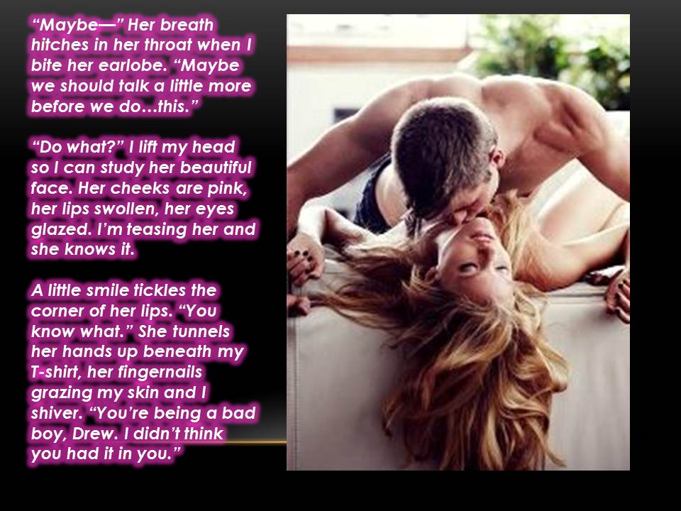 Kissing his way back up my thin frame, my body quickly came back to life and by the time his lips had reached mine, I was humming in anticipation yet again. Mason’s gray eyes sparkled down at me, full of love and affection, and for a brief moment I felt a twinge of guilt. But when he leaned down and kissed me thoroughly on the mouth, and all negative thoughts were replaced with my overwhelming need to feel wanted and loved.