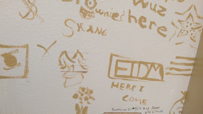 A bedroom is a seven-year-old's birthday sleepover with eight wriggling bodies giggling on the bedroom floor. A scuff on the ceiling is from a drone flown through the house.