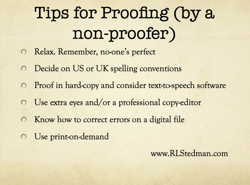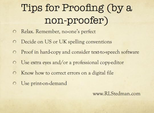 8. Use a second, or third, pair of eyes. I often ask my husband to do a final proof. He edits a scientific journal and is a very slow reader, so he picks up spelling errors. I also request advance readers - that's those readers who have kindly offered to read an early copy in exchange for a review - to let me know if they find any mistakes.