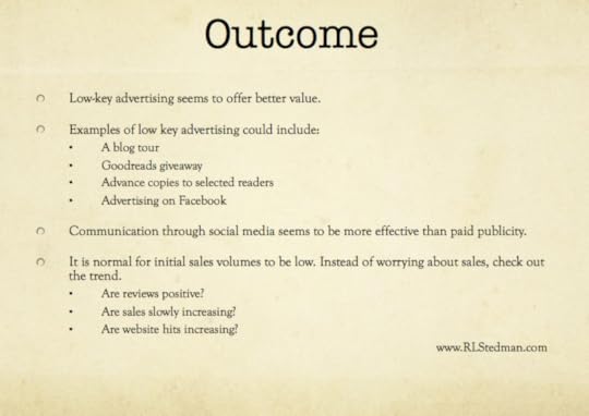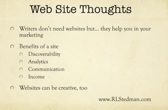 Don't forget that the website needs a domain name. www.RLStedman.com is my domain name. Your domain name could be the title of your book, or your name or something totally random. Popular domain names trade hands for thousands; a domain name has a value. If you think you've got a best seller on your hands, register its title as a domain name before anyone else does!