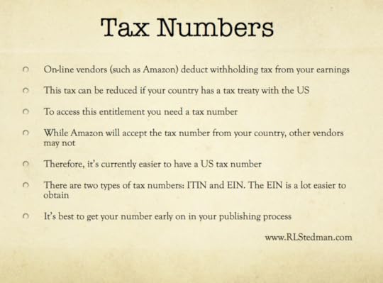 From DilbertI do recommend getting your tax number early in the process. As any interaction with the IRS is fraught with complexity, its a wise idea to get it out of the way soon as possible. Besides, the rest of the steps of getting your book to market are pretty much under your control. So, once you've got your tax number you can proceed with a fairly good idea of when your book will hit the virtual shelves.