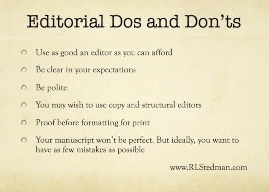 Use as good an editor as you can afford. Do not try and do it yourself; do not try and cut corners. Smashwords says 'spend money on your editor before your cover'. Basically, if you're self publishing, you'll need an even better editor than a trad publishing house. That's partly because traditional publishers do a lot of vetting at the acquisitions stage, so there's less editorial requirements. It's also because reviewers do look very critically at indie books. You want as good a review as possible.With traditional publishing, you don't have to pay an editor - the publishing house does. But if you're self publishing you're now a quasi-employer. This comes with complications. Especially money ones. My editor lives in Australia; I do not. A small business-person who likes books, she doesn't have a paypal account. I can't pay her by credit card. This meant I had to figure out how to do an international transaction. Allow for foreign exchange and transaction fees in your budgeting.Stipulate your deadline to your editor. They need to know your urgency factor so they can juggle other jobs. If it is actually urgent, tell them. Publishing houses often have contracts and so on that enforce compliance. Usually, you won't, so you need to be very clear on your requirements. Speaking of contracts: You can ask a lawyer to draw up an agreement, heck, you can draw one up yourself using an on line template. But even when I worked for a large government agency our editorial contracting was fairly adhoc. Common practise seems to be basically an email saying 'Can you do job X by time Y and I will pay you this much'. Technically, this is probably okay, although personally I think it's risky. But you don't want to alienate your amazing editor by insisting he/she signs an ten page agreement for a three hundred dollar job. Plus, it will cost you more than that in legal fees for the drafting. So just be aware that with editorial services it's probably wise to spell out your expectations, your time frame, your payment rates in advance and make sure your editor agrees to this in a return email. Editors usually appreciate this, too, as it offers them just as much protection as you.Most editors seem to charge per hour, although some charge per word count. If you have an editor on an hourly rate you might want to say 'I'll pay you up to a maximum of say ten hours and then if you need more than that, please let me know first.' That way you'll know in advance how much you'll have to spend.This might be obvious, but be POLITE to your editor. Apart from this being just ordinary human courtesy, remember you may wish to use their services again. In the self-employed sector, reputation is extremely important. If you develop a name for being hard to work with it's very possible you'll find it difficult to source good editors. Good editors get booked up real fast. One way of finding a great editor is to keep an ear to the grapevine: which publishing houses are disestablishing their in-house editors? That way you may be able to grab an amazing editor who's just starting out as freelance, so is looking for clients. Fortunately for us indie authors, there's an awful lot of publishing houses doing just that. Failing that, ask your writing buddies. Usually they'll have a few people that they would recommend. (Sometimes, they won't. Sometimes they want to keep the good editors to themselves :))You might want to consider two editors. With Inner Fire I used a structural editor first, then used a copy editor to check for spelling errors/typos. I found this helpful, as after I'd looked at the manuscript so many times I couldn't spot the mistakes, but a fresh pair of eyes did. Alternatively, you can give the final(ish) manuscript to someone who's a really, really slow, critical, reader. Although this can be problematic, especially if you don't appreciate their feedback, because at this stage in the game it is a little late to be making major changes.Then, BEFORE THE MANUSCRIPT IS FORMATTED FOR PRINT, do a final proofing. (I say this in capitals is because I never listen to myself.) The reason I emphasise this is because editing after the manuscript is formatted into a print-ready proof is expensive. I ended up paying an extra $200.00 for CreateSpace to do exactly that. Check chapter headings are formatted consistently, that they are spelt correctly. Write your back matter (the bits after the book is finished, like 'About the Author') and your back cover description.You'll find things that need to be changed at each step in the process. There are always typos, always sentences that aren't right, often spelling mistakes. My editor at harperCollins told me once that it's impossible to be a hundred-percent error free. But ideally, you want to have as few mistakes as you can.