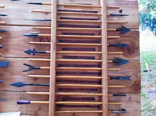 I was able to see the different types of arrow heads and to hold a sword and medieval armour - and they were a lot heavier than I had expected. A full suit of armour, said the blacksmith, weighs approximately 40 Kilos. We spoke about swords and smiths, and I thought of a phrase from Mary Stewart's The Hollow Hills - the jewels set into the hilt of Arthur's sword are 'topaz and emeralds and sapphires, which in the language of swords means joy and honour and a clean death.' (I hope I have that quote right).