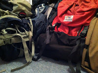 So following due consideration and plenty of research, we have decided: Packs are the Way-to-Go. So here they are, neatly lined up, ready to be filled with clothes and electronica. We have pack covers from our backpacking days, so the packs will be covered before they go on the luggage carousel. These pack covers are so large and red, we will look like Santa.