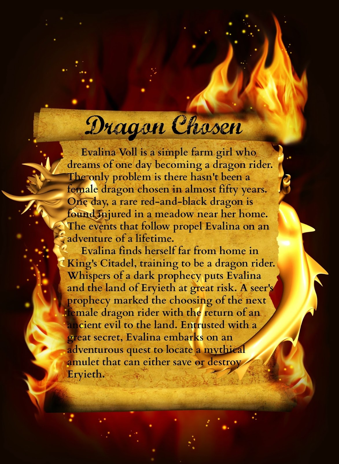 Evalina Voll is a simple farm girl who dreams of one day becoming a dragon rider. The only problem is there hasn’t been a female dragon rider chosen in almost fifty years. One day, a rare red-and-black dragon is found injured in a meadow near her home. The events that follow propel Evalina on an adventure of a lifetime.