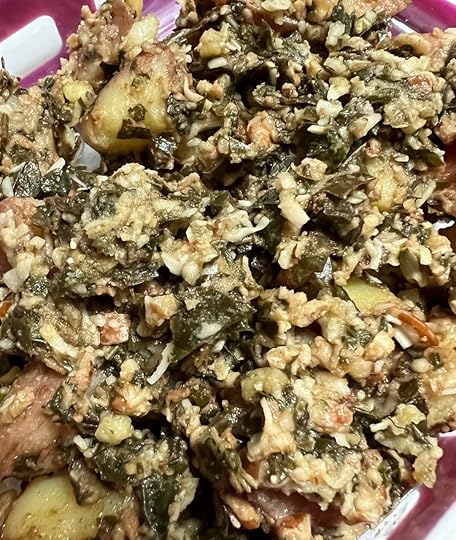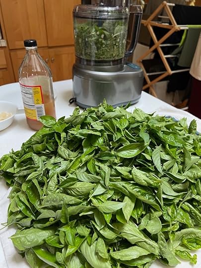 For those who are wondering what we put in our pesto, besides the two types of basil, olive oil, salt. taste, we also add loads of garlic and either pecans or almonds (because the Spousal Unit is not a pine nuts fan). We don’t put cheese in the pesto until we use it for cooking. You can see the grated parmesan in the potato dish above; it was added when the pesto was tossed with the potatoes.