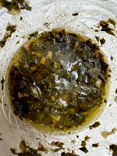 While slightly messy looking in the jar, the pesto tastes heavenly with our homegrown roasted potatoes.
