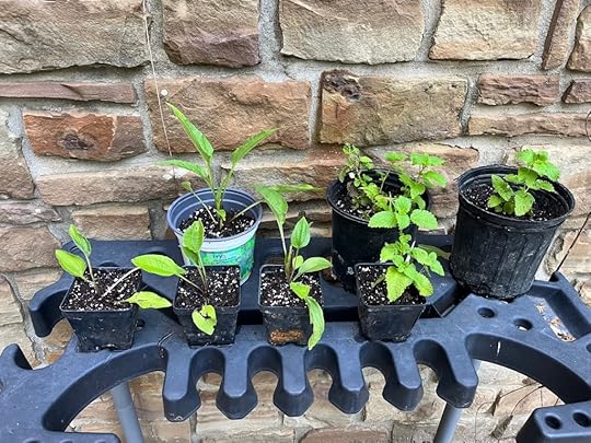 And a third category are the interesting plants that have somehow popped up in the gravel part of the driveway. They’re far too nice to let them get run over again and again by our car or delivery vehicles, so he yanked them out and potted them up. Now we have some extra black-eye Susans and lemon verbena to transplant elsewhere!