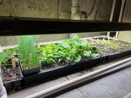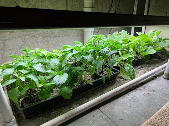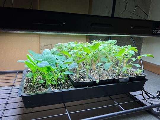 Even before the Purple Finches and Dark-eyed Juncos have migrated north, the Spousal Unit feels spring in his bones and starts plants indoors. He has a fairly simple set up of heat mats and regular fluorescent lights. And when the seedlings have grown to a certain size, he toughens them up with a slight breeze from a small fan.