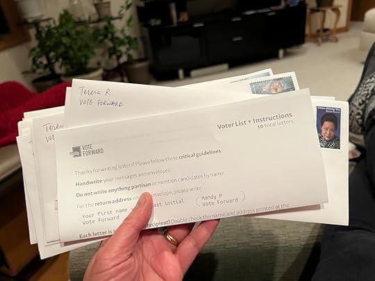 But I discovered something very interesting this past Monday when I on a call with my dad. I phone him twice a week and have him tell me the story of Journey to the West. Our conversations are in Cantonese, my mother tongue. My grasp of it is somewhat rusty having lived away from a large Cantonese population for 30+ years, but I’d still categorize myself as functionally bilingual speech-wise. While I was on the phone to dad–because it’s mostly him talking and me interjecting with a reaction every so often–I decided I would work on the VoteForward letters I’m writing for the GA election runoff.