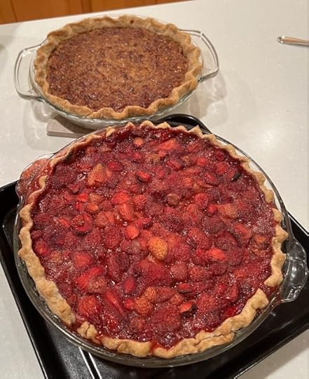 But the highlight for me is usually dessert. This year, I made a pecan pie and…oddly…a strawberry pie. We had a bunch of strawberries in the freezer from our abundant summer harvest and it seemed like a good idea to clear some out.