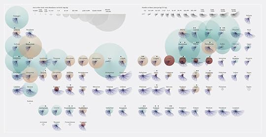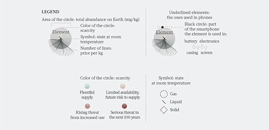 For each element the following data have been visualized: total abundance on Earth, scarcity, price per kg, state at room temperature and part of the smartphone the element is used in.
