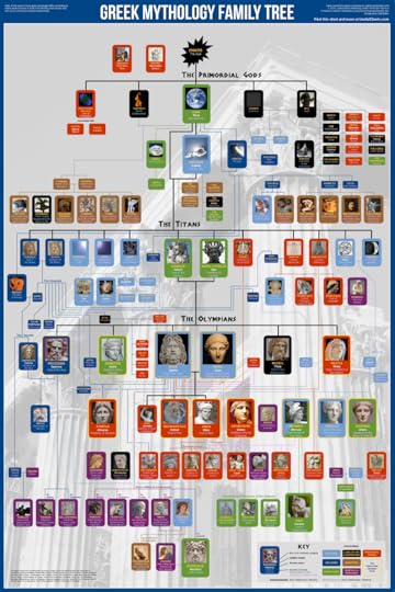 Fans of Rick Riordan’s Percy Jackson books will love this poster! Covering all three generations of Greek gods (Primordial, Titans, and Olympians), it displays both the Greek and Roman names for the gods as well as their titles or functions. It is also color-coded to distinguish between sea gods, sky gods, earth gods, underworld gods, personifications, monsters, demigods, and mortals.