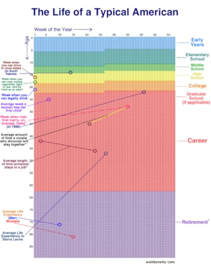 Your Life in Weeks infographic is the life of a typical American broken down into the 52 weeks within each year. This infographic was created by Tim Urban from Wait But Why. Each dot represents one week of your life. The infographic highlights some of the major milestones in life, while color coding the weeks into the big categories of schooling, career, and retirement.