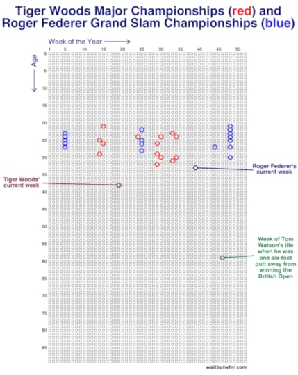 Tiger Woods Major Championships (red) and Roger Federer Grand Slam Championships (blue) is another example. This chart makes it easy to track the peak years for athletes.