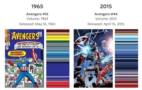 Jon Keegan at the Wall Street Journal has created a fascinating interactive data visualization of the last 50 Years of ‘Avengers’ Comic Book Covers Through Color.