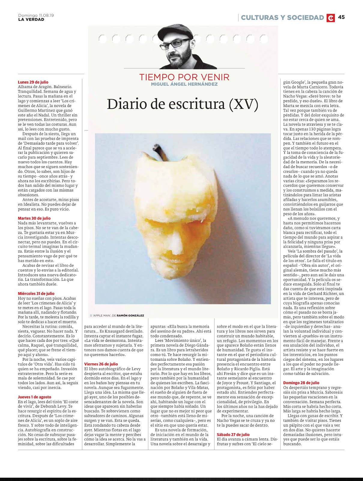 Viernes 1 de agostoEl libro autobiográfico de Levy despierta al escritor, que estaba dormido estos días. En el lago y en los baños hoy piensas en tu novela. Aunque sea fugazmente. Llega una idea. La misma que llegó ayer, uno de los posibles desencadenantes de la novela. Son ideas que aparecen sin haberlas buscado. Te sobrevienen como salteadores de caminos. Algunas surgen y se van. Esta se queda. Está rondando tu cabeza desde ayer. Mientras flotas en el lago dejas vagar la mente y percibes cómo la idea se acerca. No la vas a desarrollar. Simplemente la apuntas: “Ella busca la memoria del asesino de su padre”. Ahí está todo condensado. Lees ‘Movimiento único’, la primera novela de Diego Gándara. Es un libro para letraheridos como tú. Te hace resurgir la mitomanía sobre Bolaño. Y entiendes perfectamente esa pasión por la literatura y el mundo literario. Por lo que hay en los libros, pero también por la humanidad de quienes los escriben. La fascinación por Bolaño y Vila-Matas, el sueño de alguien de fuera de ese mundo que, de repente, se ve ahí, habitando un lugar con el que siempre había soñado. Un lugar que no es mejor ni peor que otro –también está lleno de miserias, como cualquiera–, pero es el sitio en que uno quería estar. Es una novela de formación, de iniciación en el mundo de la literatura y también en la vida. Una novela sobre el desarraigo y sobre el modo en el que la literatura y los libros nos sirven para construir un mundo habitable, un refugio. Los momentos en los que aparece Bolaño están llenos de humanidad. Te gusta el instante en el que el periodista cultural protagonista de la historia presencia el encuentro entre Bolaño y Ricardo Piglia. Está ahí Fresán y dice que es un instante semejante al encuentro de Joyce y Proust. Y Santiago, el protagonista, es feliz por haber estado ahí. Entiendes perfectamente esa sensación de excepcionalidad, de privilegio. En los últimos años no la has dejado de experimentar. Por la noche, una canción de Nacho Vegas se te cruza y ya no te la puedes sacar de dentro.