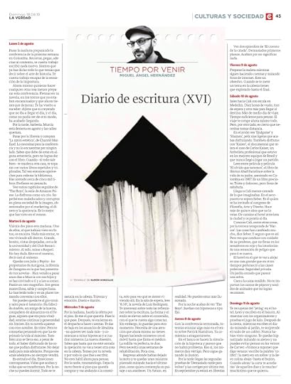 Domingo 18 de agostoLlegas a las siete de la mañana a Madrid y consigues tomar el tren de las nueve. Durante el trayecto no haces otra cosa que dormitar. Rememoras el viaje y piensas que ha merecido la pena. Te ha complacido la experiencia. Pero también es cierto que no veías ya el momento de regresar. Cuando llegas a Murcia y te encuentras con Raquel parece que ha pasado una eternidad. Ha sido una semana, pero se te ha hecho infinita. Nunca más, te repites una y otra vez. Antes de acostarte, recibes al mail una invitación para la feria del libro de La Habana. Respondes que sí, por supuesto; será un placer cruzar el océano.