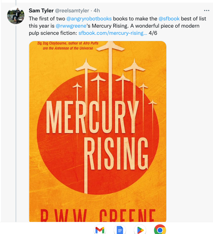 “I loved this book. I loved the retrò atmosphere, the pop references, the mix of classic and contemporary sci-fi with alternate history. I love these things and I loved the well-developed and interesting characters.” — From NetGalley, not my mom or an AIThe sequel to Mercury Rising — the end of the First Planets Duology — Earth Retrograde, will hit the bookstores Oct. 24.