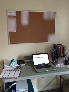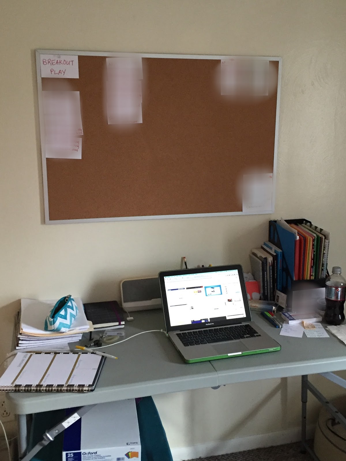 Desk 2.0. Still a bit messy, but better than before.And yes, I blurred out story details on the story board!